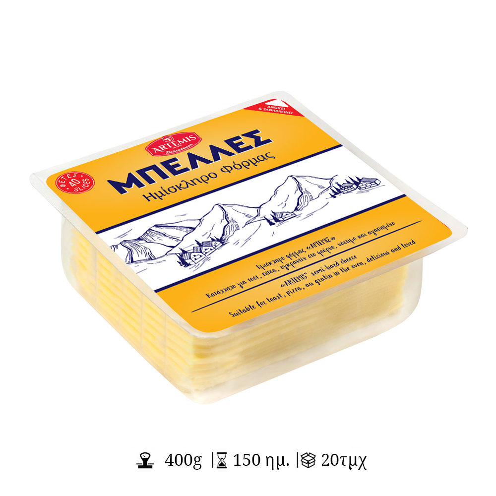 Αυθεντική γεύση με παραδοσιακό χαρακτήρα. Το ημίσκληρο τυρί Μπέλλες της ΑΡΤΕΜΙΣ, σε πρακτικές φέτες, προσφέρει πλούσια υφή και ήπια γεύση, ιδανική για τοστ, σάντουιτς ή σνακ. Καθημερινή απόλαυση με ποιότητα και φροντίδα.