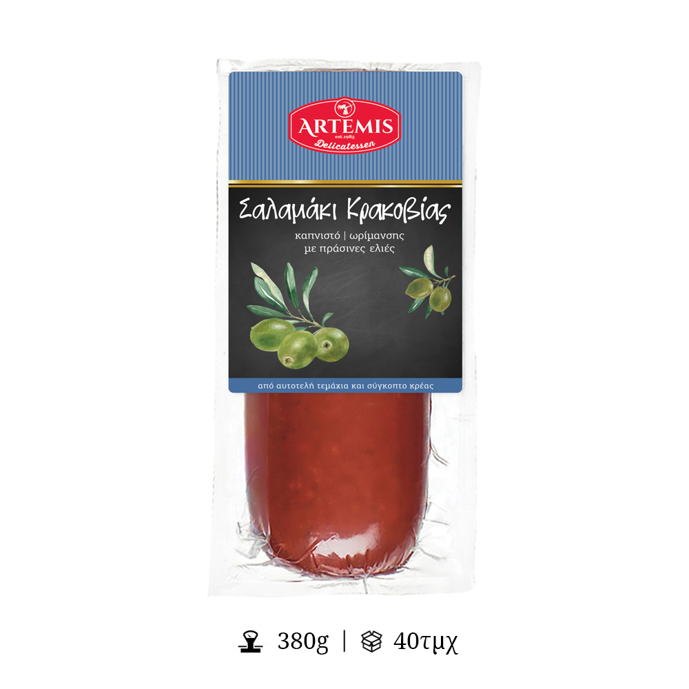 Το Σαλάμι Κρακοβίας με Ελιές – ΑΡΤΕΜΙΣ συνδυάζει την πλούσια, καπνιστή γεύση με τη διακριτική ένταση της ελιάς, προσφέροντας ένα ιδιαίτερο γευστικό αποτέλεσμα. Ιδανικό για platters και σάντουιτς, ξεχωρίζει για την ποιότητα και την ισορροπία του.