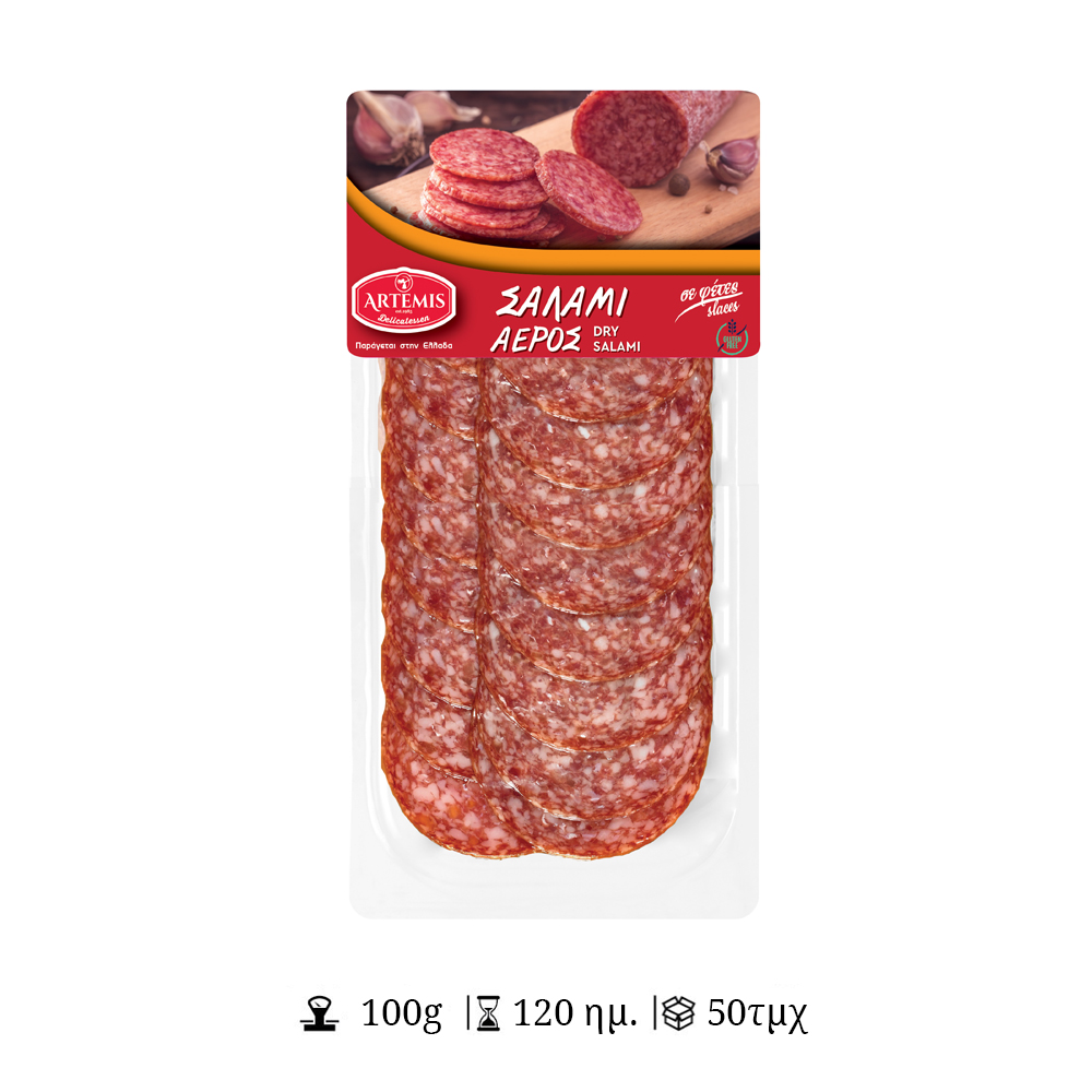 Πλούσια γεύση και παραδοσιακή υφή σε κάθε φέτα. Το σαλάμι αέρος της ΑΡΤΕΜΙΣ ωριμάζει φυσικά, προσφέροντας μεστή γεύση και φίνο άρωμα. Ιδανικό για πλατό αλλαντικών, σάντουιτς ή ως συνοδευτικό σε κρασί και μεζέδες.