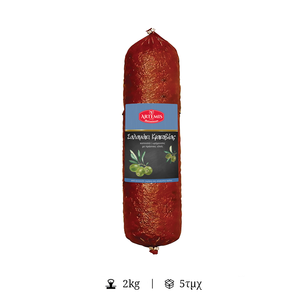 Το Σαλάμι Κρακοβίας με Ελιές – ΑΡΤΕΜΙΣ συνδυάζει την πλούσια, καπνιστή γεύση με τη διακριτική ένταση της ελιάς, προσφέροντας ένα ιδιαίτερο γευστικό αποτέλεσμα. Ιδανικό για platters και σάντουιτς, ξεχωρίζει για την ποιότητα και την ισορροπία του.